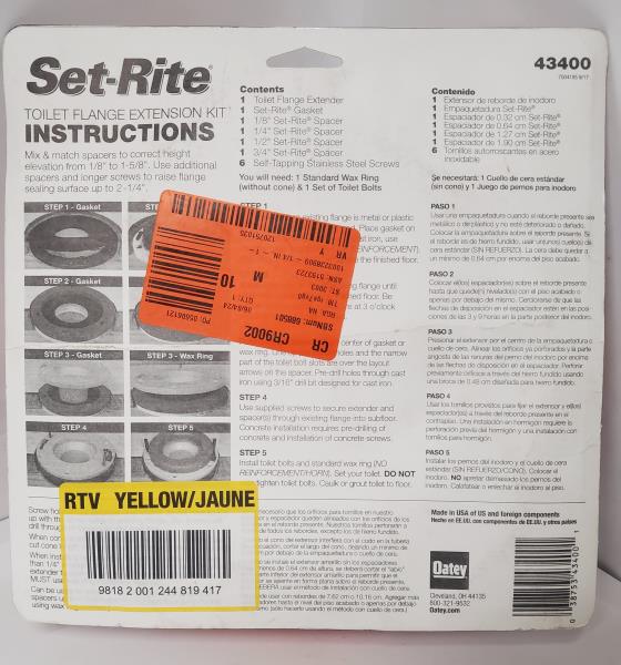 Oatey Set-Rite Toilet Flange Extension Kit is a watertight solution for raising the toilet flange during a remodel. This extension kit provides the ability to easily extend the flange surface above the finished floor for optimum sealing with a standard wax ring. The kit includes four different size spacers and six self tapping screws to complete the installation. Oatey products have earned the trust of plumbing professionals for over 100 years.