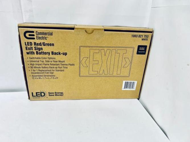 LED Red/Green Exit Sign the Commercial Electric LED exit sign with battery back-up is ideal for applications requiring a reliable, bright and energy efficient life safety solution. Its Red or Green switchable feature makes it suitable for multiple state and local codes. It can be wall, top or end mounted. Color: White.