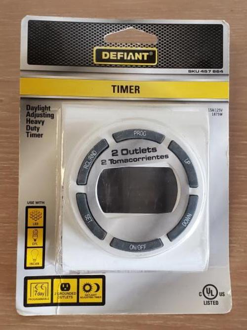 Save energy, save money and feel secure. The Defiant Daylight Adjusting 7-Day 2-Outlet Plug-In Digital Timer delivers convenient automation for lamps, seasonal lighting, appliances and electronics. Controls 2 lights or other devices. Daylight Adjusting option provides sunset and sunrise times for easy settings - adjusts automatically when there is a daylight saving time change in your area. Simply set it and forget it. Random vacation security option adds quick DIY security - providing peace of mind while you are away. The on/off override switch gives you ultimate freedom by providing a seamless transition between programmed settings and manual use. Power outage backup ensures your timer is ready to use at a moment's notice. Color: White.