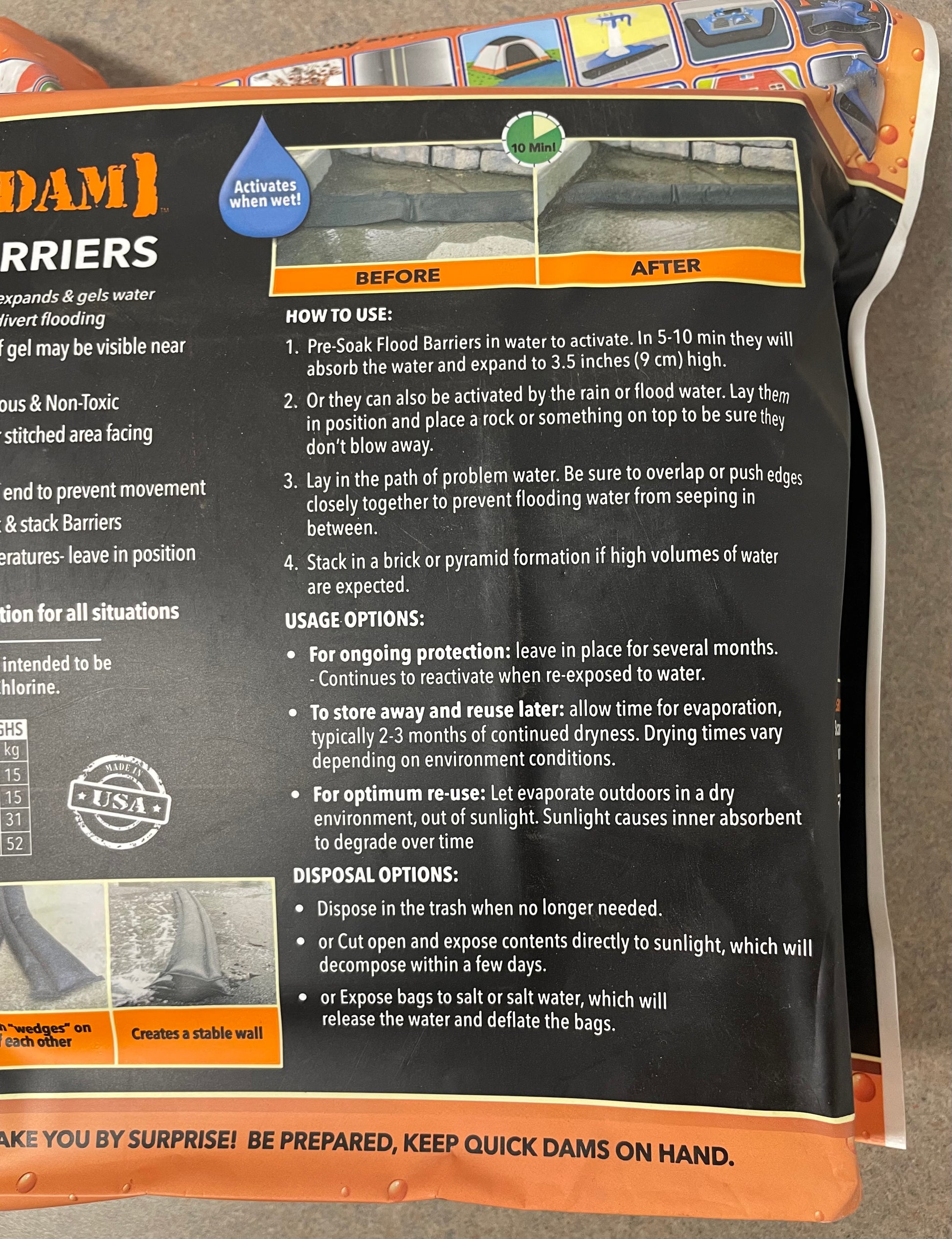 Protect your home or property in times of flooding with patented Quick Dam Food Barriers. Quick Dams expand and activate on contact with water. Just lie in place and let the water do the rest. Absorb contain and divert problem water away from your home and property, before it becomes a problem. Keep some on hand for emergency situations. Use around doorways, garages, leaking tanks, construction projects, anywhere water is a problem.