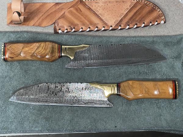 Elevate your knife collection with the ultimate addition: a stunning custom hand-made Damascus Steel Chef knife from NoonKnives. Crafted with a Olive wood handle, this knife is not only stylish but provides a comfortable grip for all your cutting needs. This knife is a true masterpiece of craftsmanship.